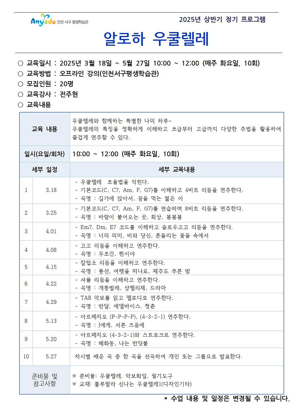 ※ 준비물: 우쿨렐레, 악보화일, 필기도구