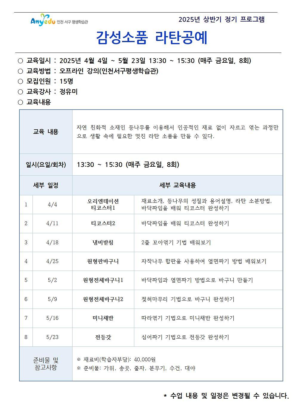 *개인준비 : 가위, 송곳, 줄자, 분무기, 수건, 대야