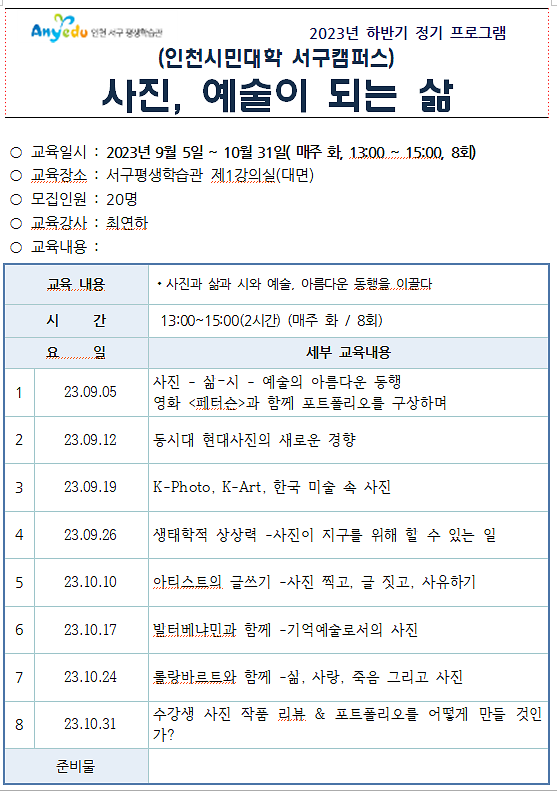 교육일정 : 2023.9.5.~10.31.(화, 13:00~15:00, 2시간 총8회)