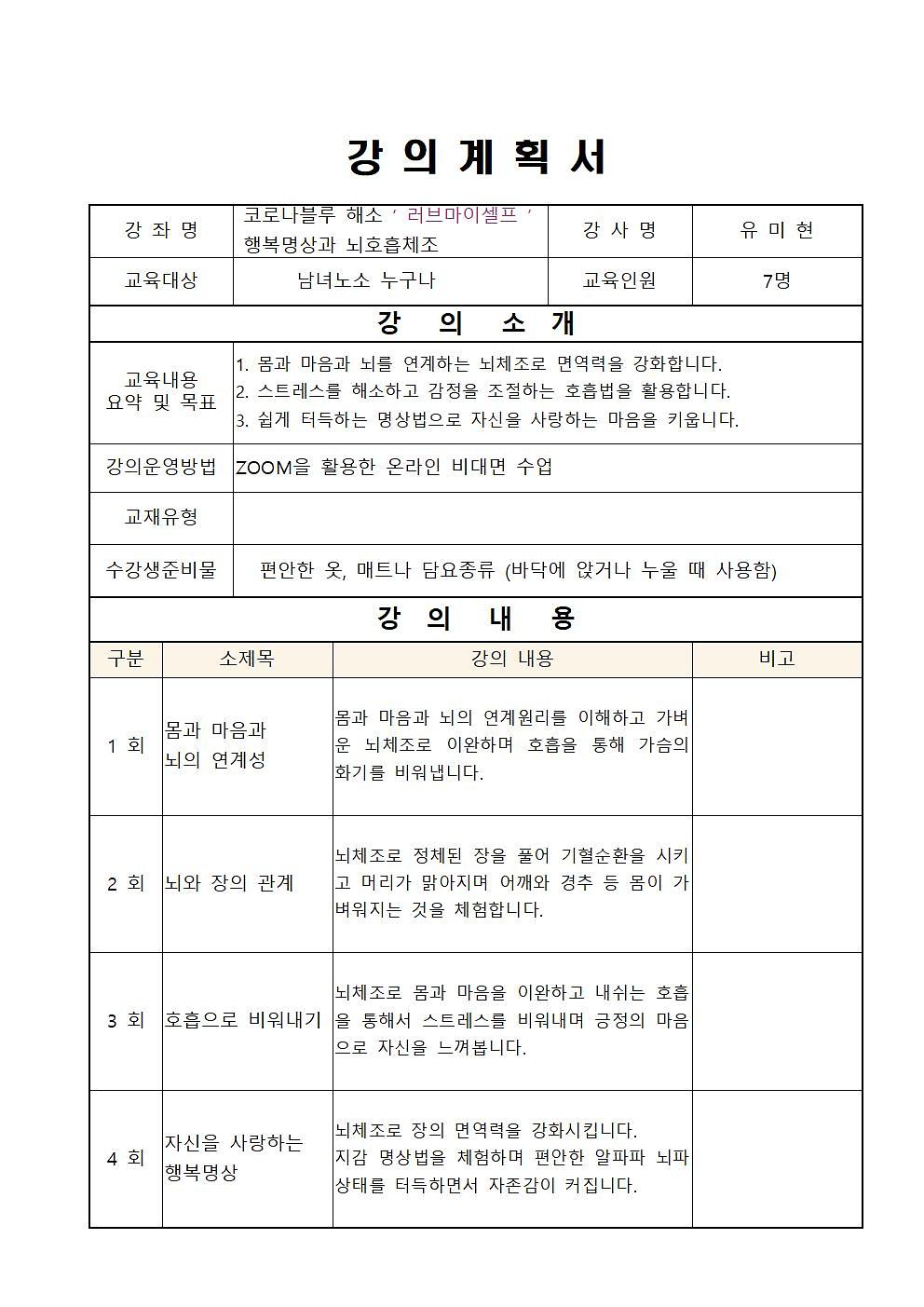 행복명상과 뇌호흡체조, 코로나블루 해소 '러브마이셀프'