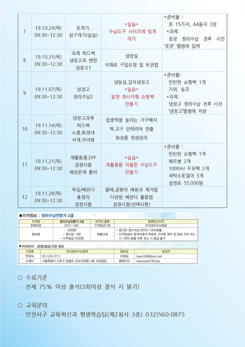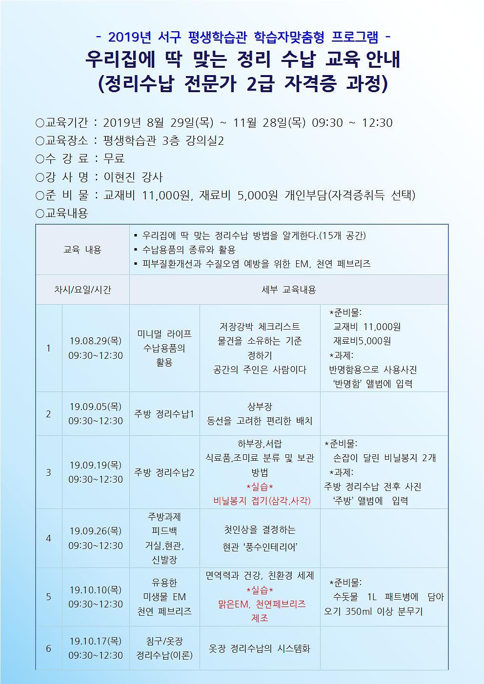우리 집에 딱 맞는 정리수납 방법 안내, 수납용품의 종류와 활용, 피부질환 개선과 수질오염 예방을 위한 EM, 천연 페브리즈 교육 ※교재비(11,000원),재료비(5천원)개인부담 자격증발급비(55,000원)선택
