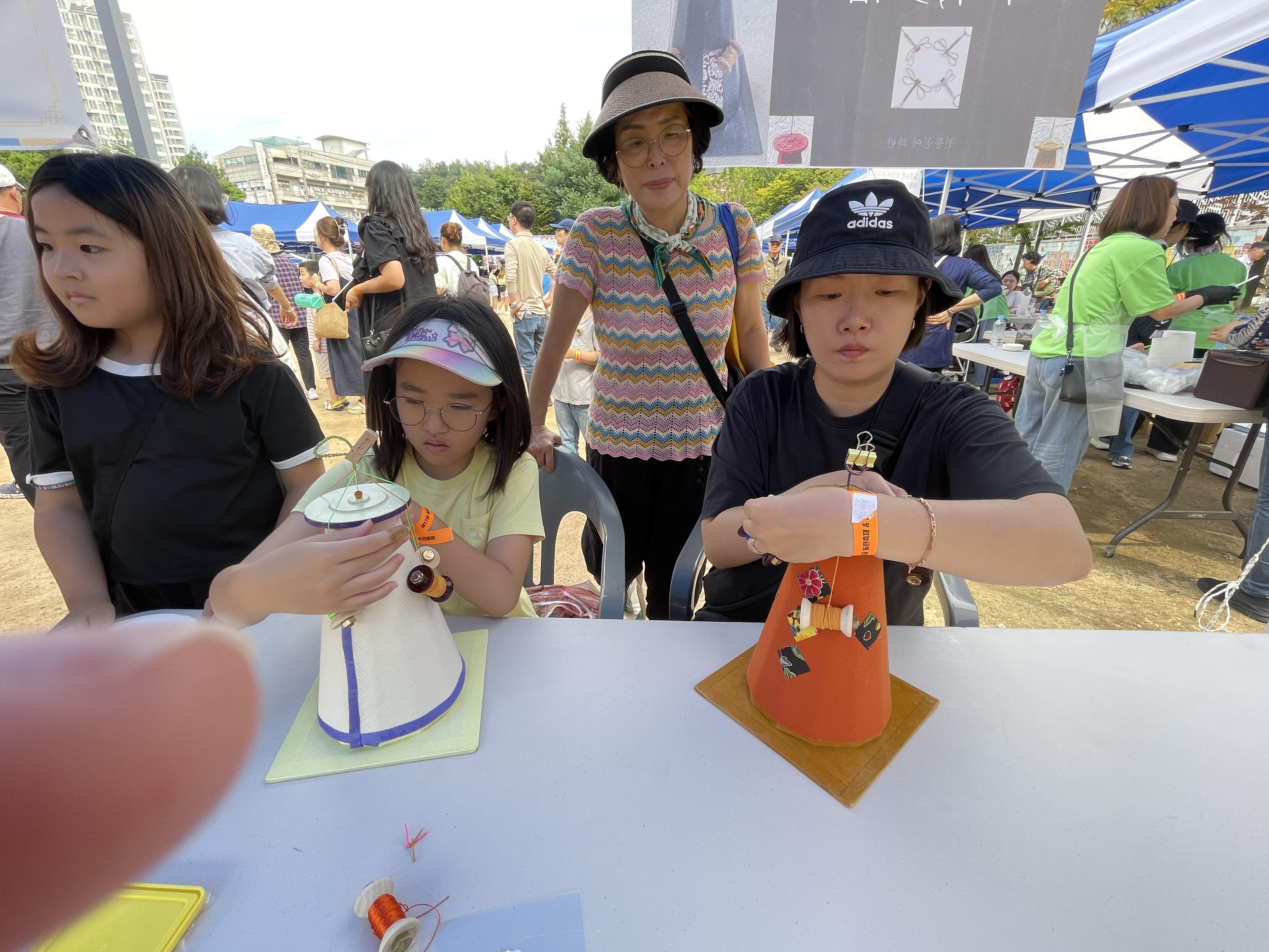 고무밴딩을 토작에 감아 4사치기 기법으로 팔찌머리끈 만들기 체험부스를 운영했습니다.