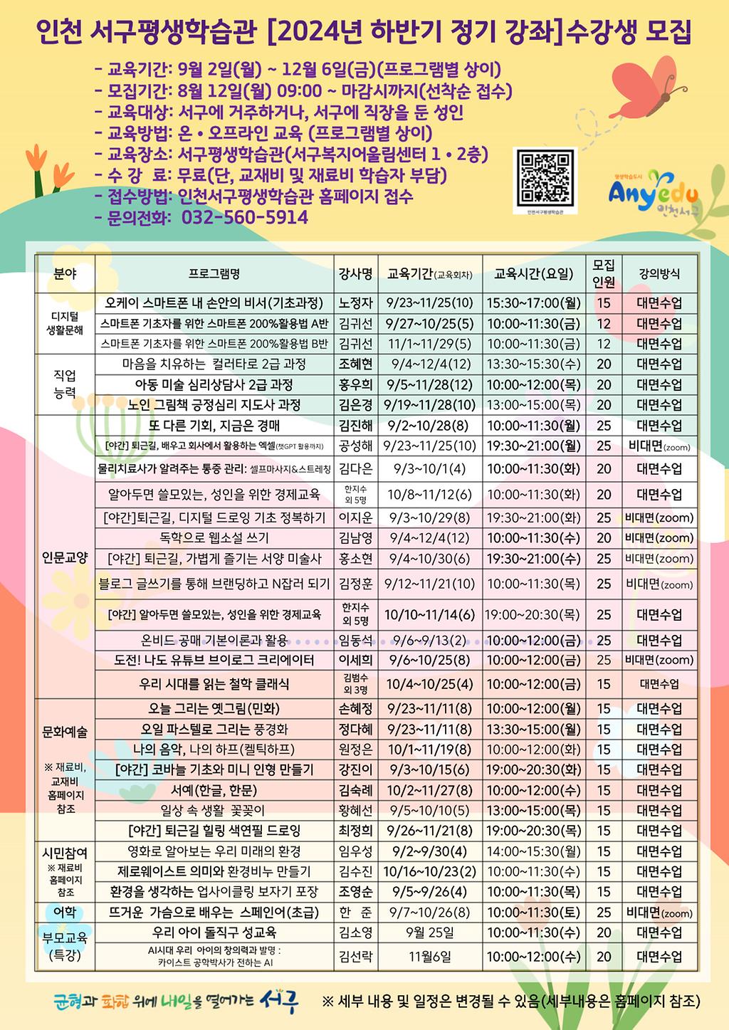 인천서구 평생학습관 [ 2024년 하반기 정기 강좌 수강생] 모집