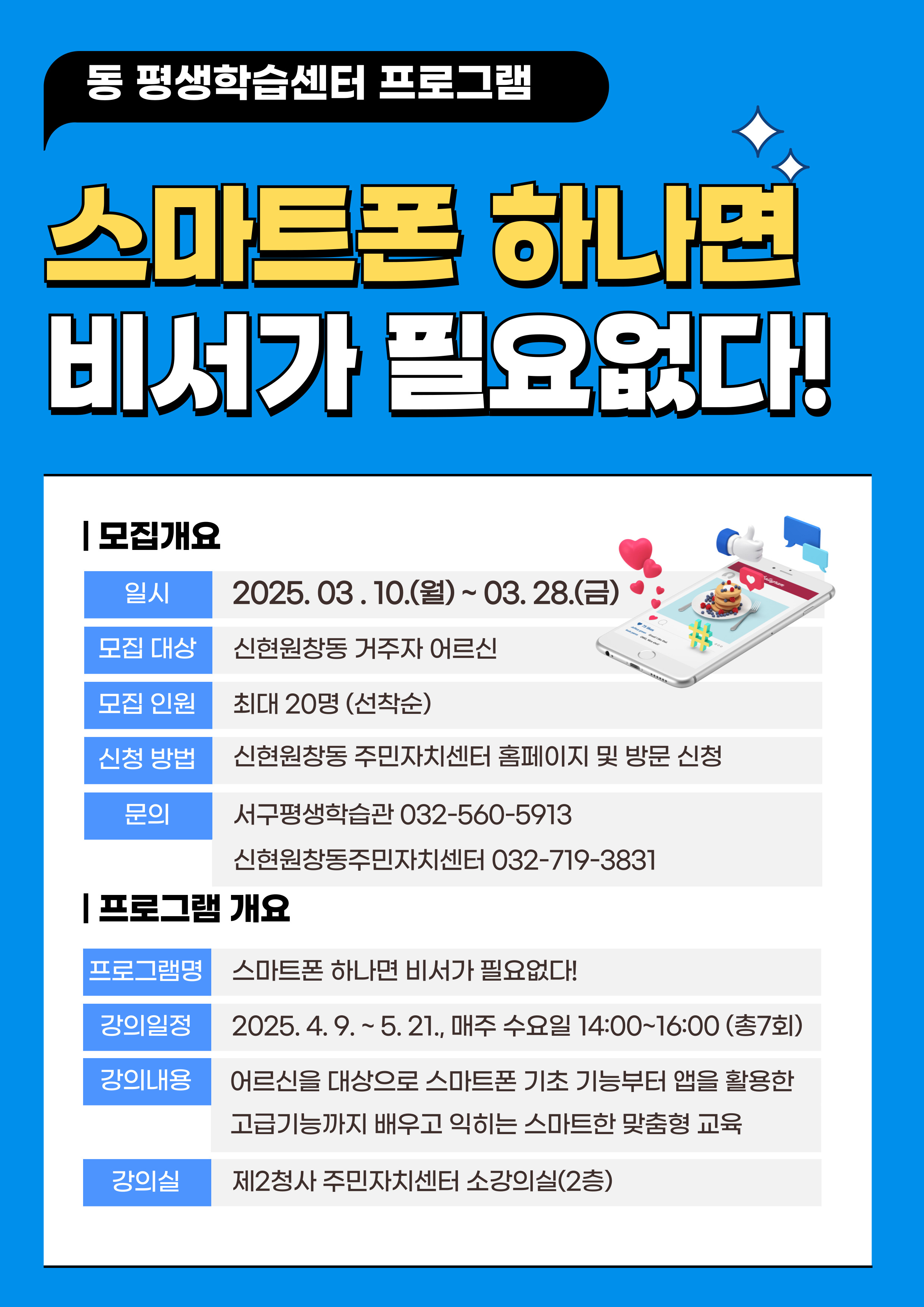 [서구평생학습관 신현원창동 평생학습센터] 스마트폰 하나면 비서가 필요없다!! 수강신청 안내(기간연장)