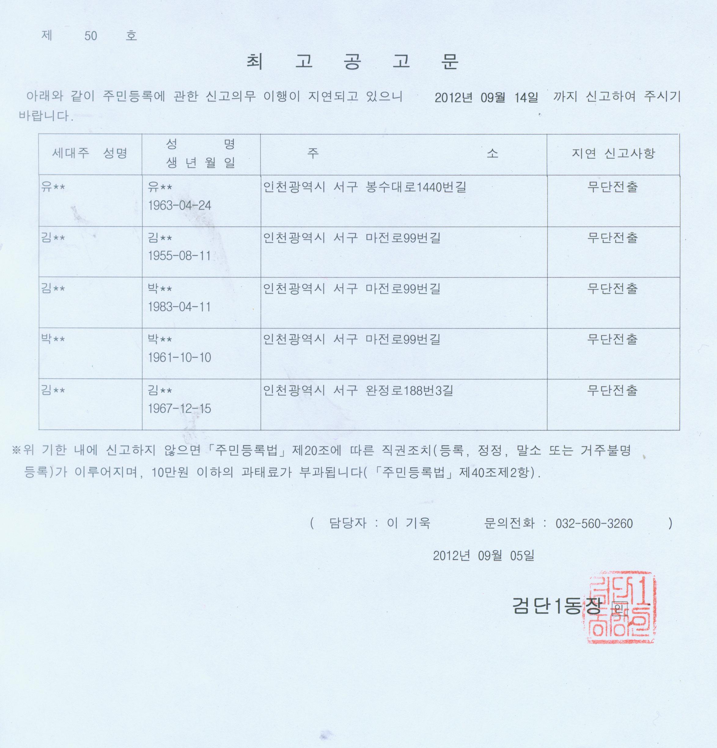 2. 주민등록 무단전출자에 대해 주민등록법 제20조 및 동법시행령 제28조의 규정에 의거 일정기간 내에 신고하도록 최고를 하였으나, 최고장의 반송으로 최고를 할 수 없어 아래와 같이 해당 무단전출자에 대해 공고하고자합니다.