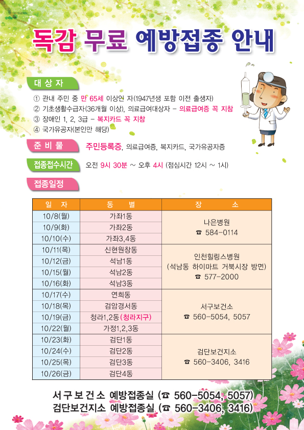 붙임과 같이 독감예방접종 안내를 하오니 해당 주민께서는 많은 이용 바랍니다.