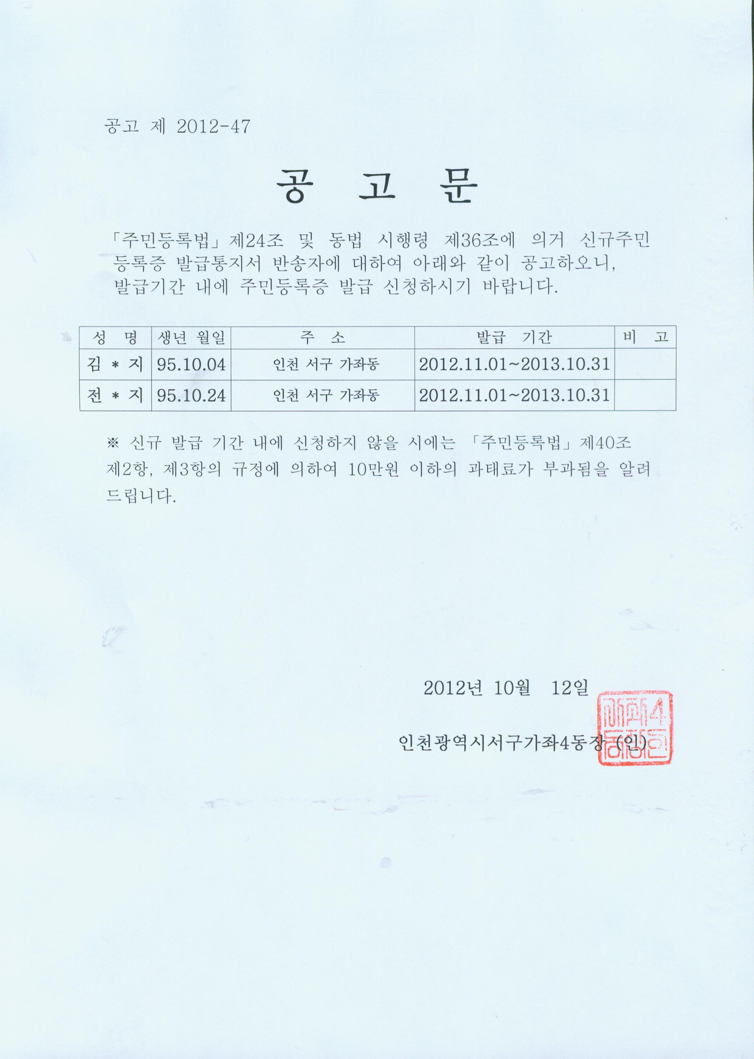 다. 공고내용: 발급기간(2012.11.01.~2013. 10.31.)내에 주민등록증 발급신청 안내