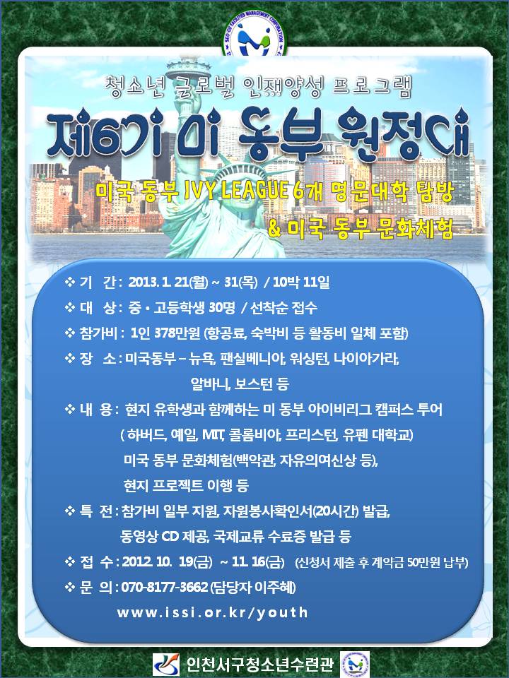「제6기 미 동부 원정대」를 운영하오니 관심 있는 청소년들의 참여 바랍니다.