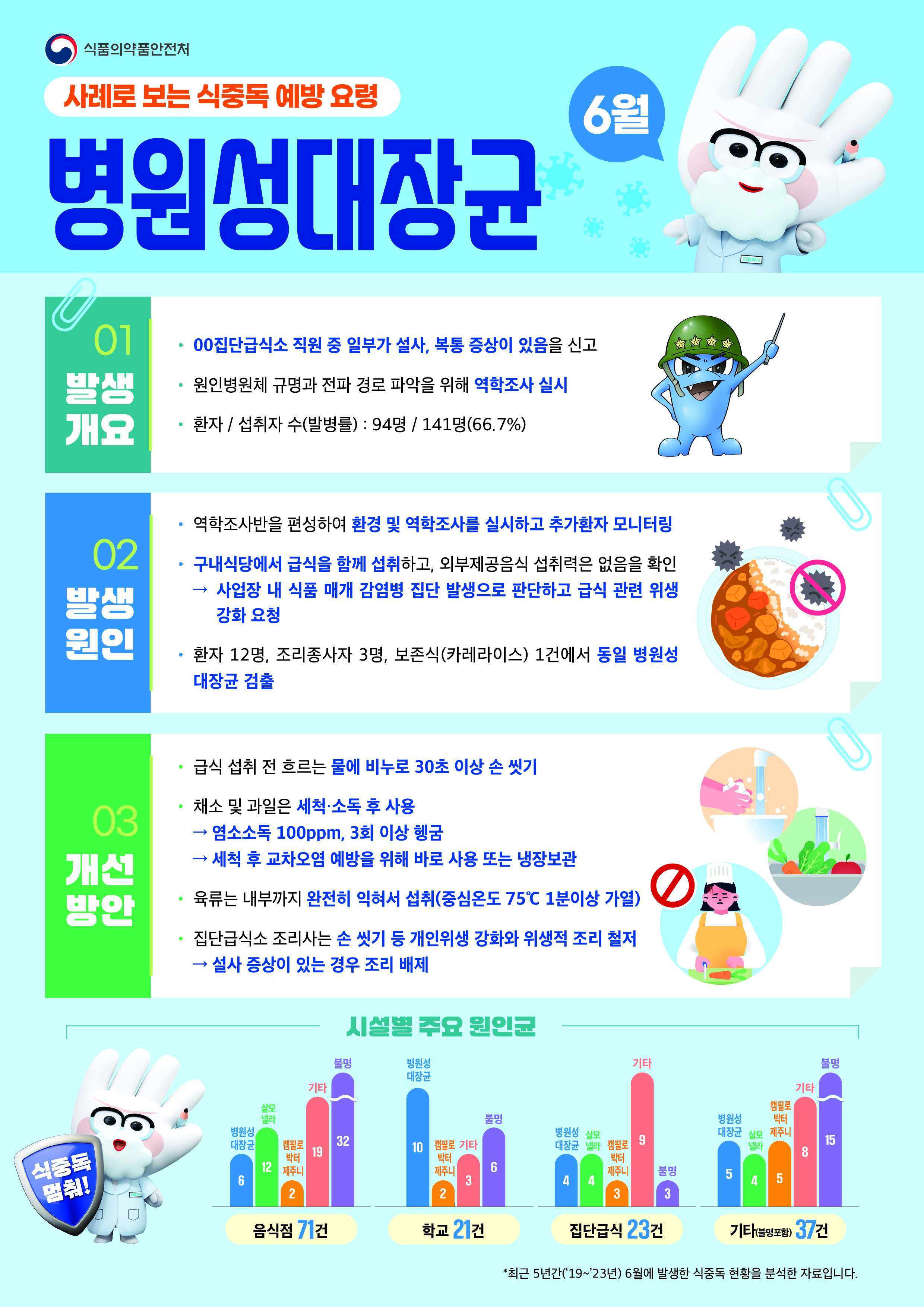 식중독 예방을 위해 최근 5년간 6월의 식중독 발생현황을 분석하여 위와 같이 식중독 주의 정보를 알려드리니