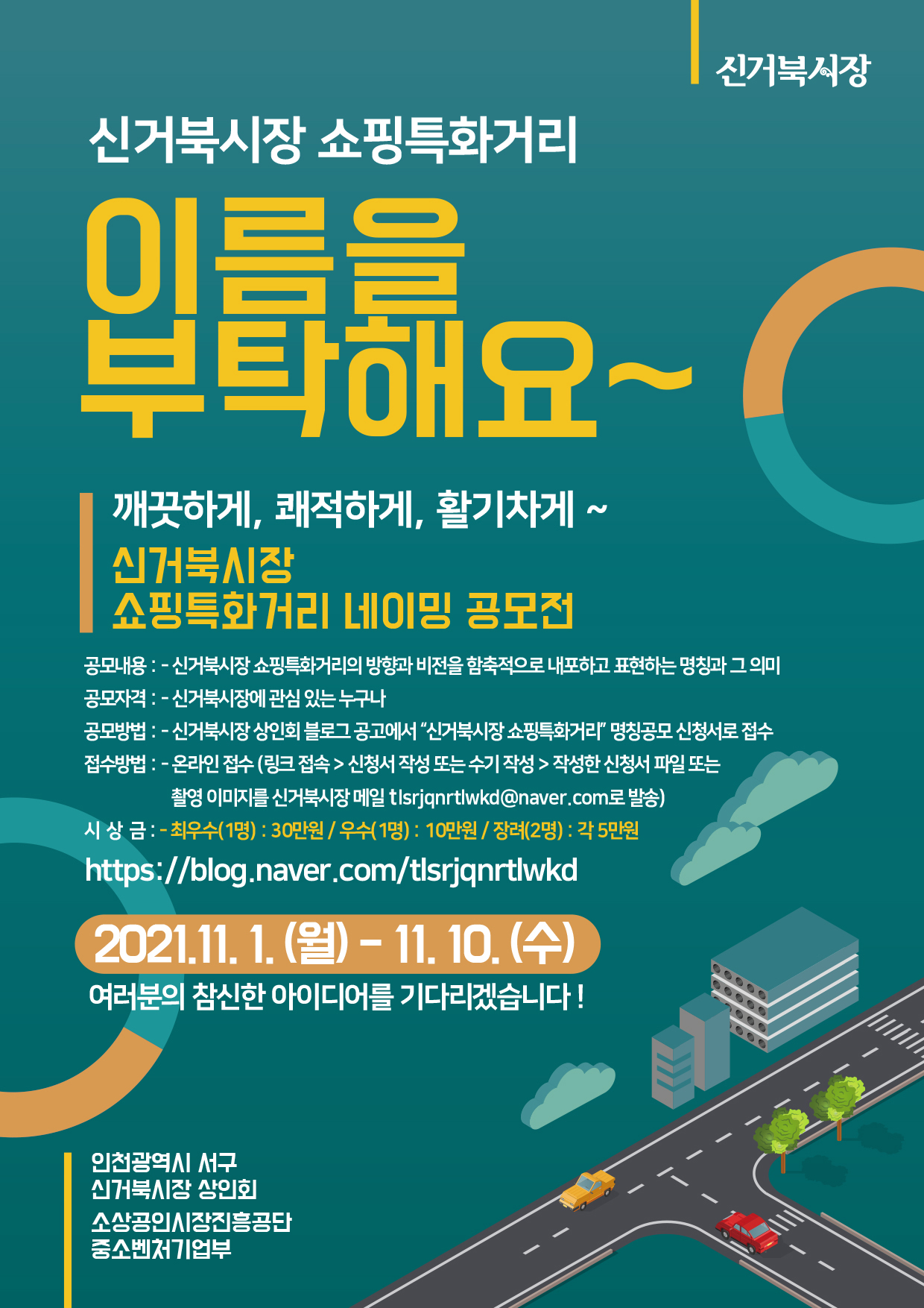 신거북시장상인회에서는 「신거북시장 쇼핑특화거리 네이밍 공모전」을 실시하오니, 주민 여러분의 많은 참여 바랍니다.