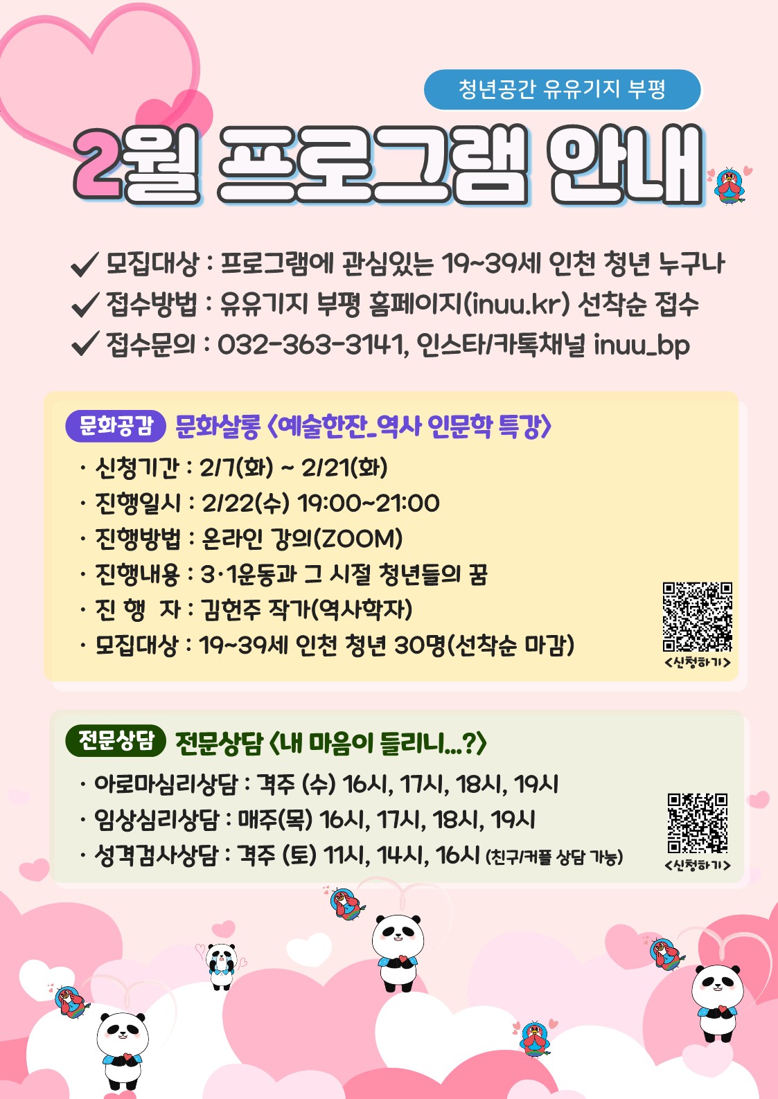 인천 청년을 위한 2월 프로그램을 진행하고자 하오니, 포스터 참고하시어 많은 참여 부탁드립니다.