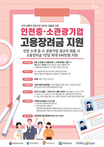 인천광역시와 인천관광공사는 인천 소재 중소규모 관광기업의 구인난 완화 및 지역일자리 창출을 위해 고용장려금을 지원해주는「2024 인천 중·소 관광기업 고용지원 사업」을 실시합니다. 많은 관심과 참여 바랍니다.