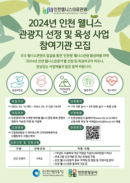 인천관광공사에서는 <2024년 인천 웰니스관광지 선정 및 육성 사업> 참여기관을 모집하고 있으니, 관심 있으신 사업체들의 많은 참여바랍니다.