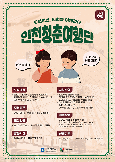 인천관광공사에서 지역 청년과 함께 새로운 인천 여행을 만들어가기 위해「인천청춘 여행단 3기」모집을 진행하오니 관심 있으신 분들의 많은 참여 바랍니다.