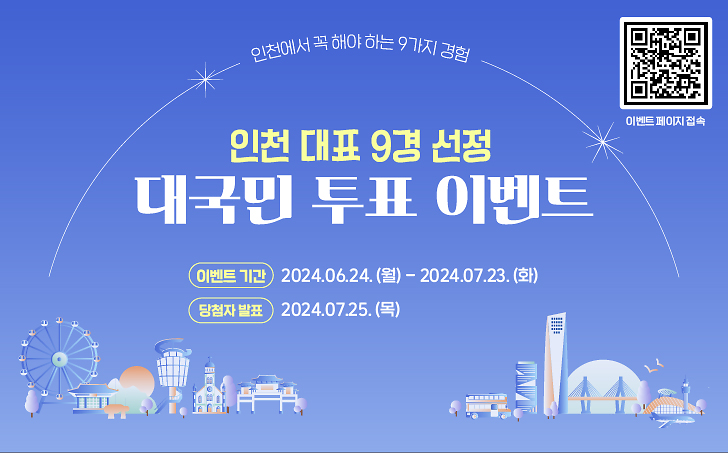 대표성 있는 관광자원 발굴을 위해 '인천9경(經)'을 선정하고자 아래와 같은 온라인 이벤트를 실시하고 있습니다.