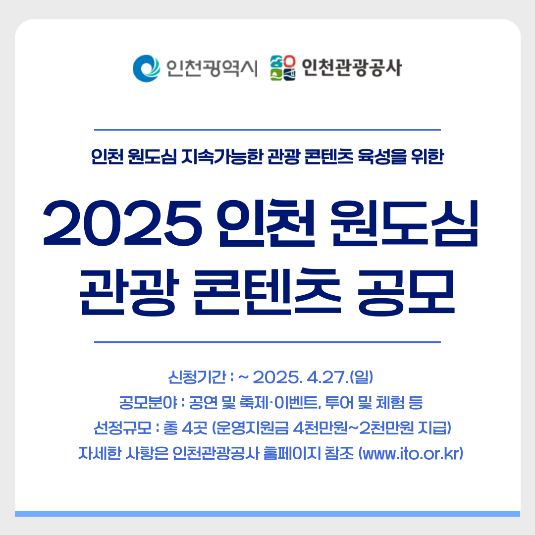 인천관광공사에서 「2025 인천 원도심 관광 콘텐츠 공모」 사업을 추진하오니, 관심 있으신 분들의 많은 참여 바랍니다.
