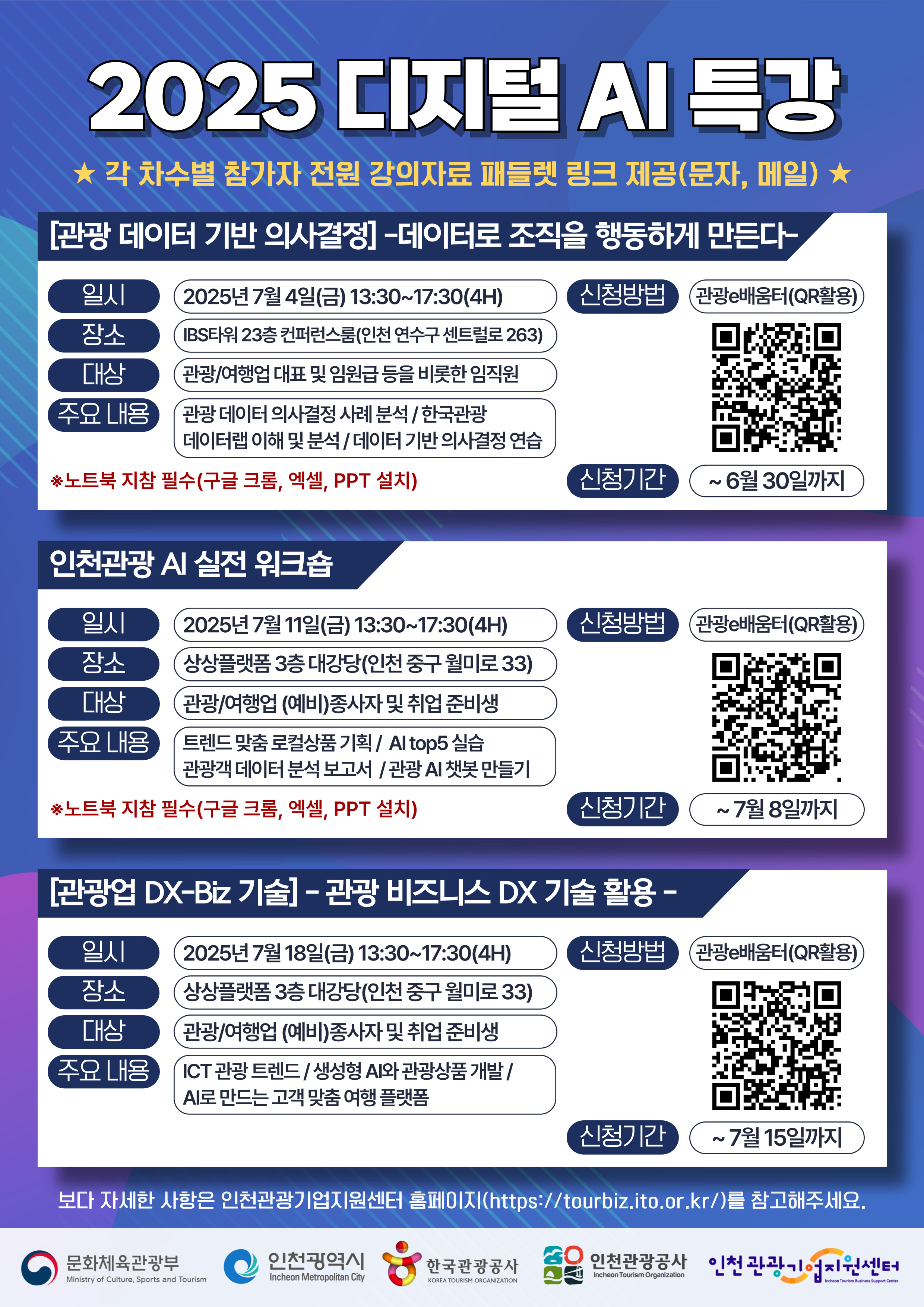 인천관광공사는 한국관광공사와 함께 지역 관광사업 (예비)종사자의 디지털 및 AI역량 강화를 위한 「2025 디지털 AI 특강」을 운영하고 있습니다. 관심있으신 분들의 많은 참여 바랍니다.