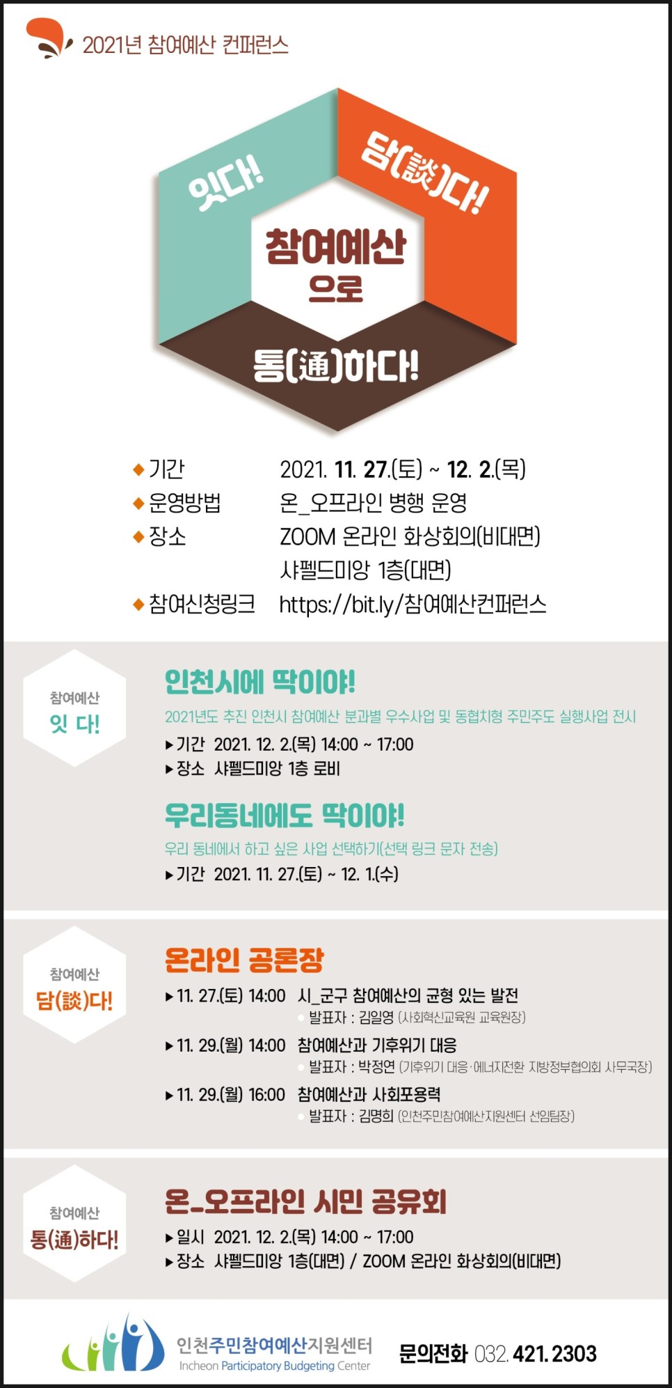 인천시에서는 상기 포스터와 같이 참여예산 컨퍼런스를 개최할 예정이오니,