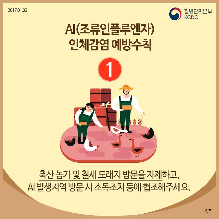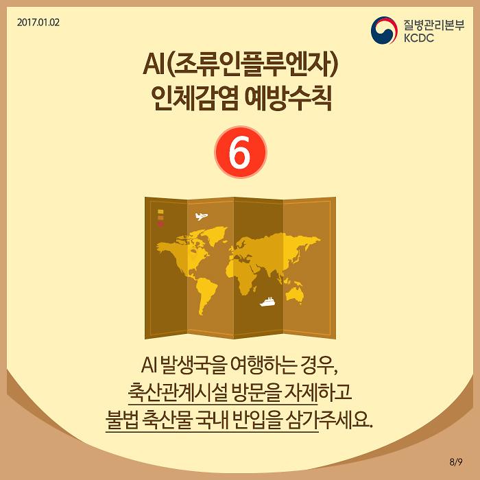 ❍ 가금류 시장, 축산관계시설, 철새도래지 방문을 자제하고 불법 축산물 국내 반입을 삼가 주십시오.