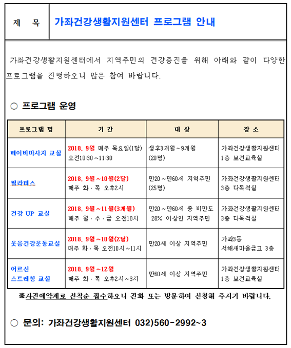 가좌건강생활지원센터 9월 프로그램 운영 안내