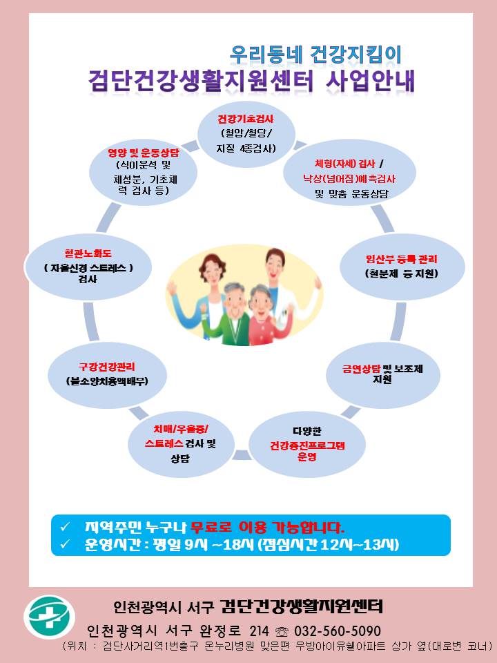 서구보건소 검단건강생활지원센터에서는 지역주민의 건강증진을 위하여 다양한 건강증진프로그램을 운영하고 있습니다. 2019년 1분기 건강증진프로그램은 붙임의 안내문을 참고하시기 바랍니다.