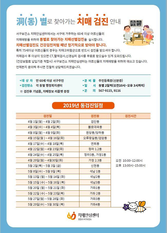 2019년 동 주민자치센터로 찾아가는 치매,우울,스트레스검진 일정 안내
