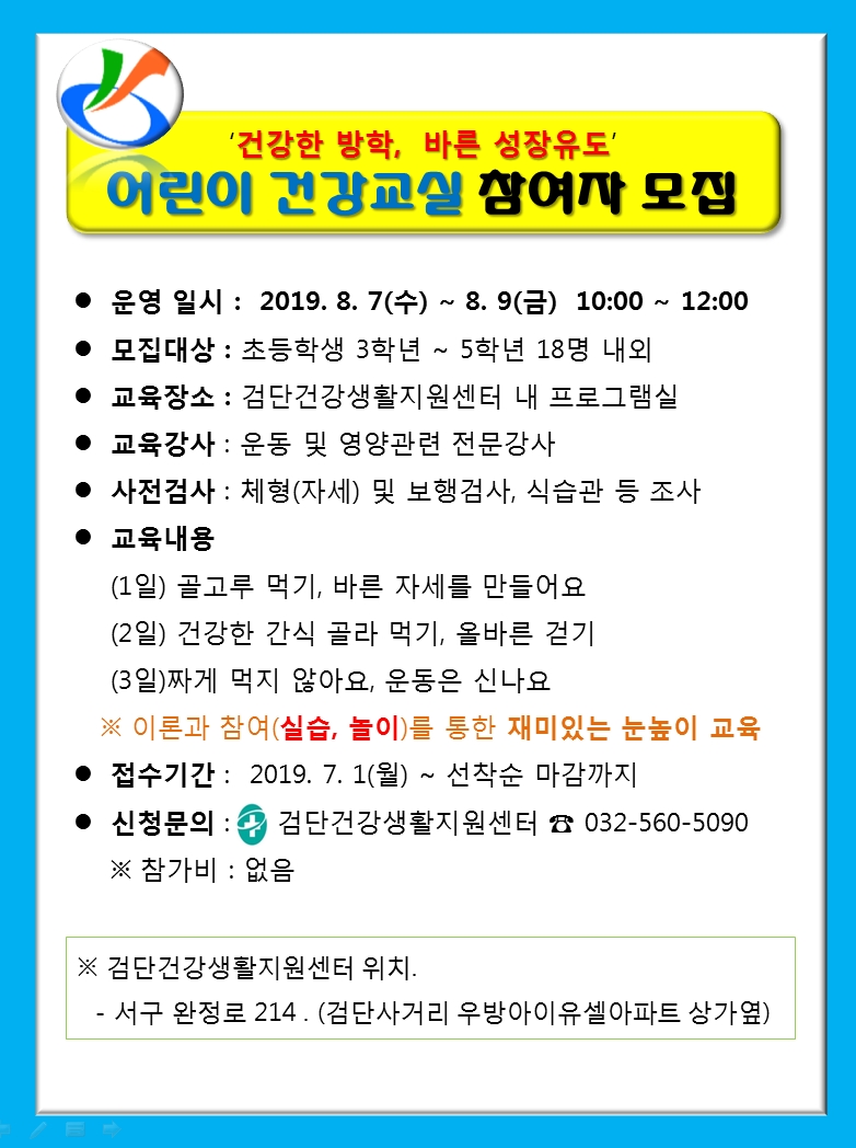 '건강한 방학, 바른성장 유도' 어린이 건강교실 참여자 모집