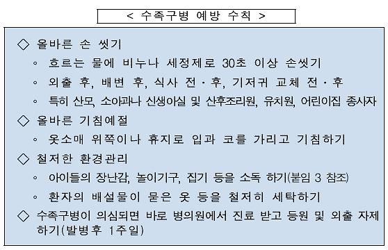 수족구병 예방을 위해 외출 후, 배변 후, 식사 전후, 기저귀 교체 전후 손씻기를 생활화 해주시길 당부드립니다.