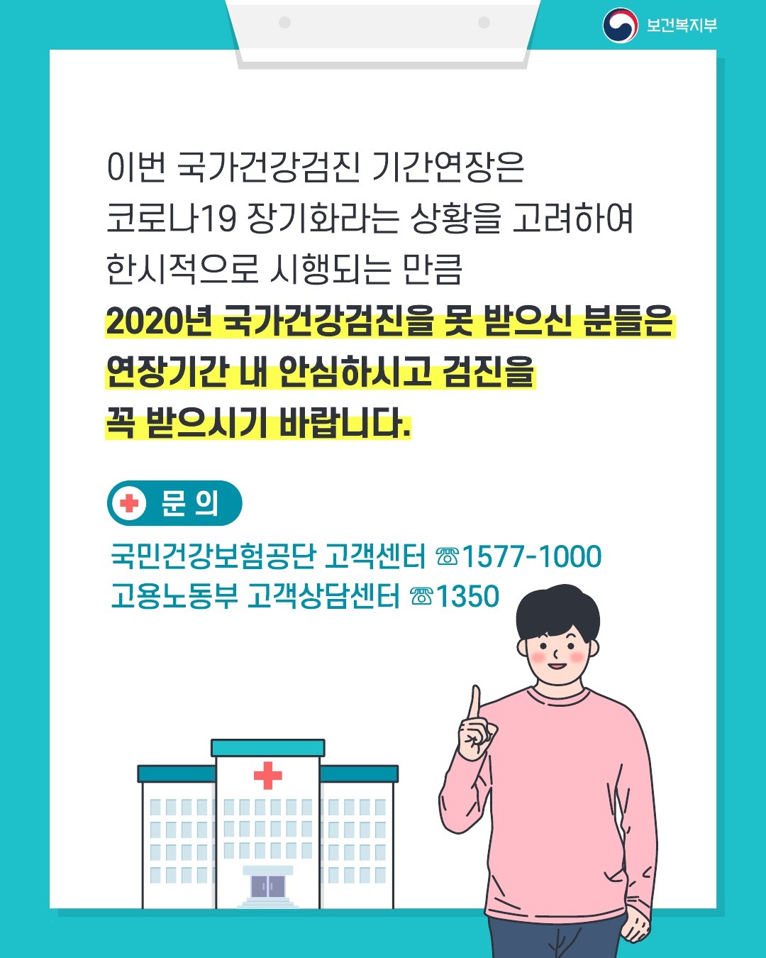 이번 국가건강검진 기간연장은 코로나19 장기화라는 상황을 고려하여 한시적으로 시행되는 만큼 2020년 국가건강검진을 못 받으신 분들은 연장기간 내 안심하시고 검진을 꼭 받으시기 바랍니다.