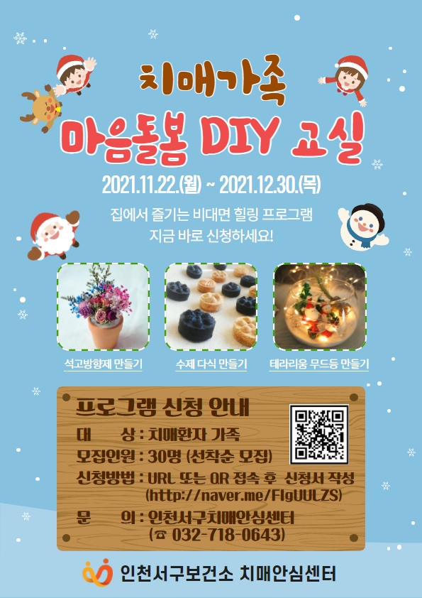 서구치매안심센터에서는 치매환자 및 가족을 위해 돌봄부담에 따른 스트레스를 해소하고 심리적 부담을 경감하고자 치매가족 비대면 힐링프로그램 및 자조모임 「마음돌봄 DIY 교실」을 아래와 같이 운영하오니 많은 참여 바랍니다.