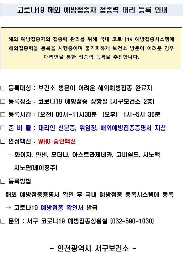 코로나19 해외 예방접종자 접종력 대리 등록 관련 홈페이지 게시