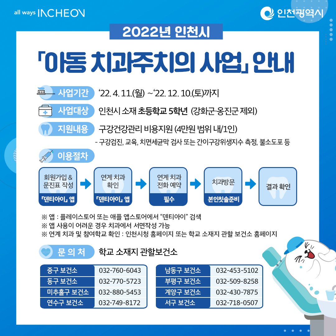 귀 댁의 자녀가 평생 구강건강관리 기반을 다질 수 있도록 아동 치과주치의 사업에 적극적인 참여 바랍니다.