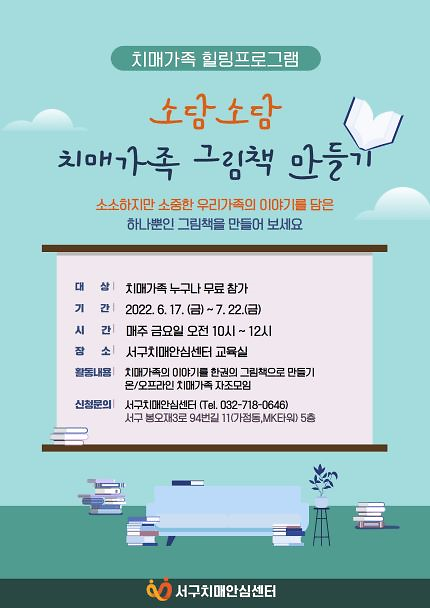 2022년 제2기 치매가족 힐링프로그램 <소담소담 치매가족 그림책 만들기>를 운영하오니 주민 여러분의 많은 관심 부탁드리며,