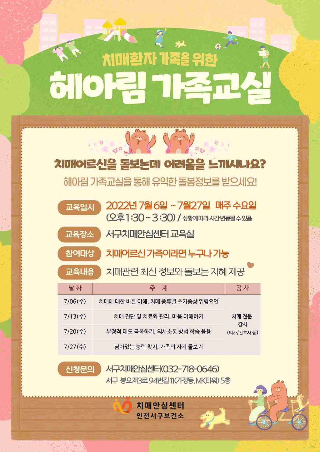 가족교실에 참석을 희망하시는 분은 서구치매안심센터로 문의(032-718-0646)하여 주시기 바랍니다.