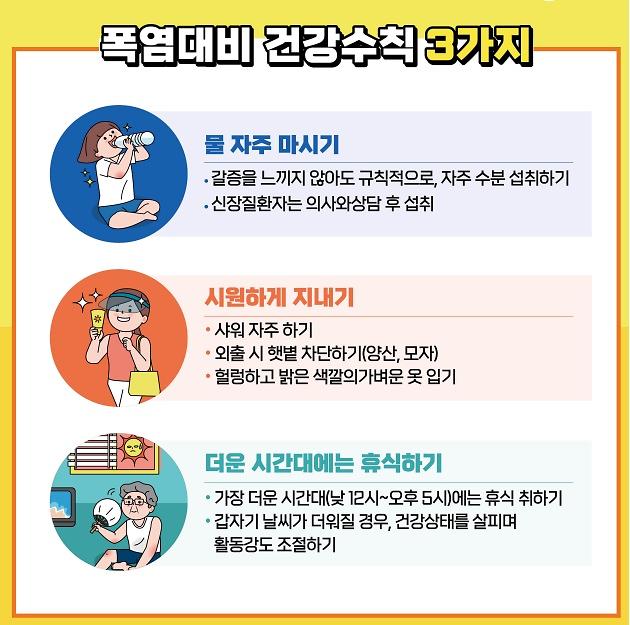 여름철 폭염으로 인한 폭염대비 3대 건강수칙을 안내드립니다.