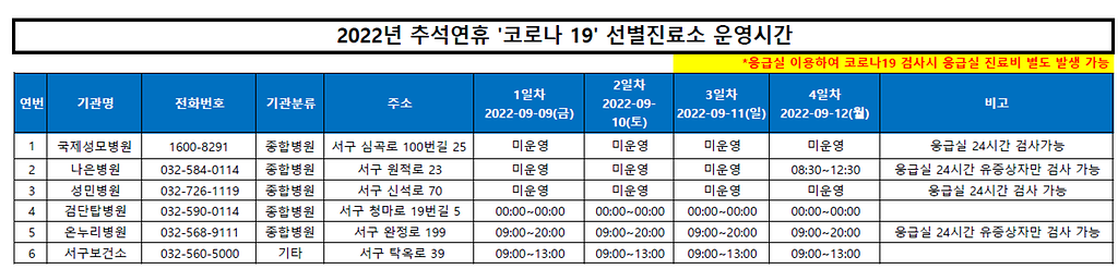 연휴기간 코로나19 선별진료소 운영 현황에 대하여 아래와 같이 안내드립니다.