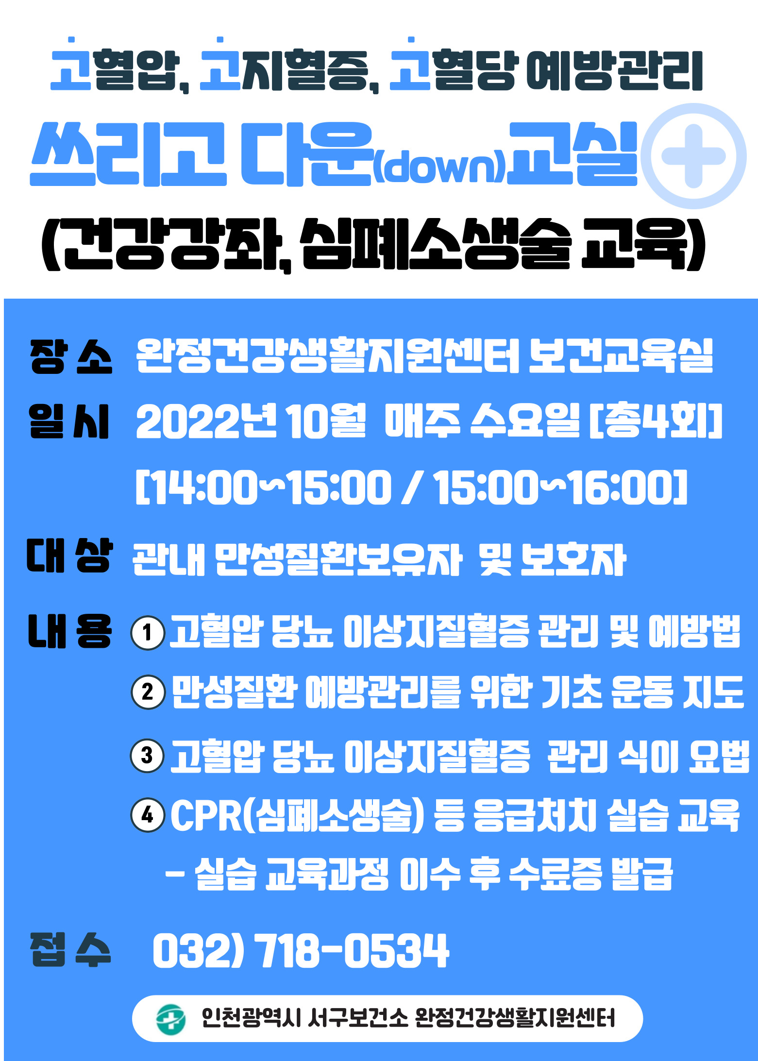 완정건강생활지원센터 『쓰리고(고혈압,고지혈증,고혈당) 다운(down) 교실 4기』참여자 모집