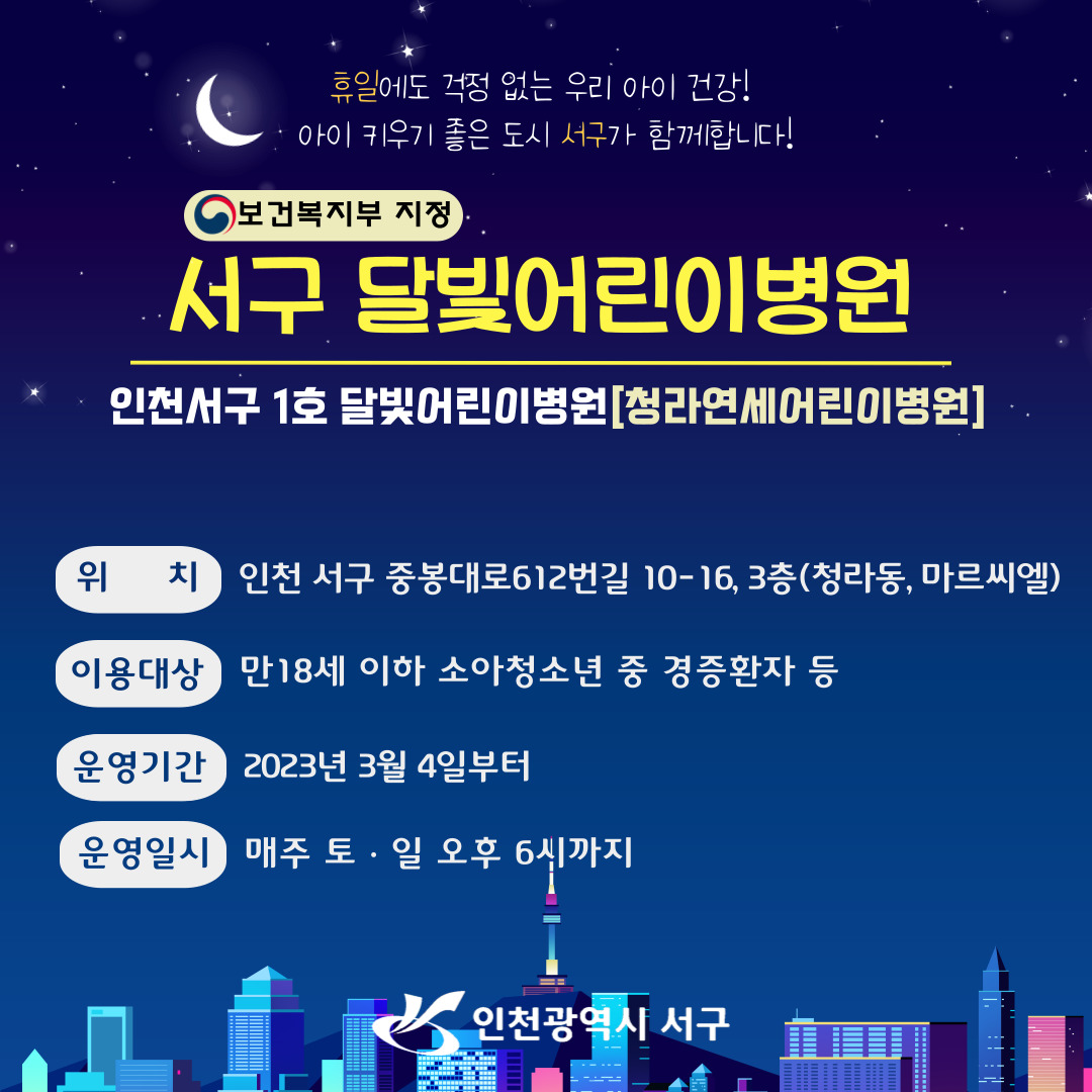 야간 및 휴일에 소아 경증환자의 응급실 이용에 따른 불편 해소와 비용부담을 경감하고, 신속한 의료서비스를 제공하기 위해 “달빛어린이병원”을 운영하오니 구민 여러분의 많은 관심 바랍니다.