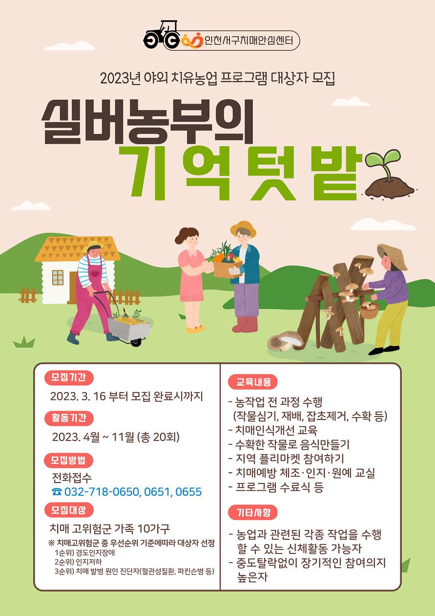 서구치매안심센터에서는 치매예방을 위한 야외 치유농업 프로그램『실버농부의 기억텃밭』을 운영하오니,