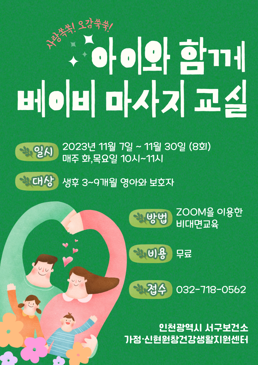 서구보건소 가정·신현원창건강생활지원센터에서 「비대면 베이비마사지교실」참여자를 모집 중이오니 많은 관심 부탁드립니다.