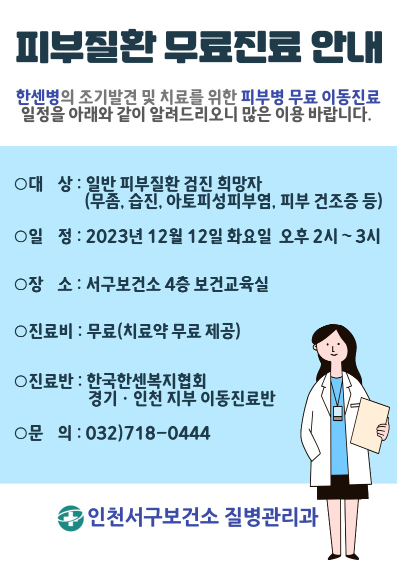 한센병의 조기발견 및 치료를 위한 피부병 무료 이동진료 일정을 알려드리오니 많은 이용 바랍니다.