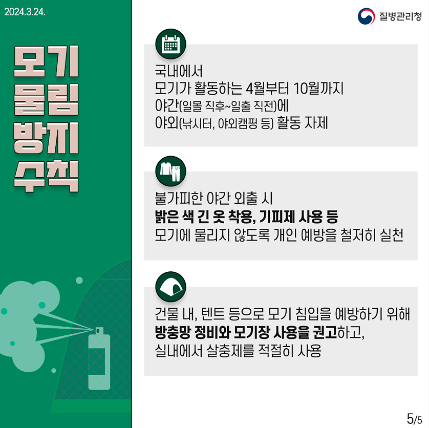 - 불가피한 야간 외출 시 밝은 색 긴 옷 착용, 기피제 사용 등 개인 예방을 철저히 실천