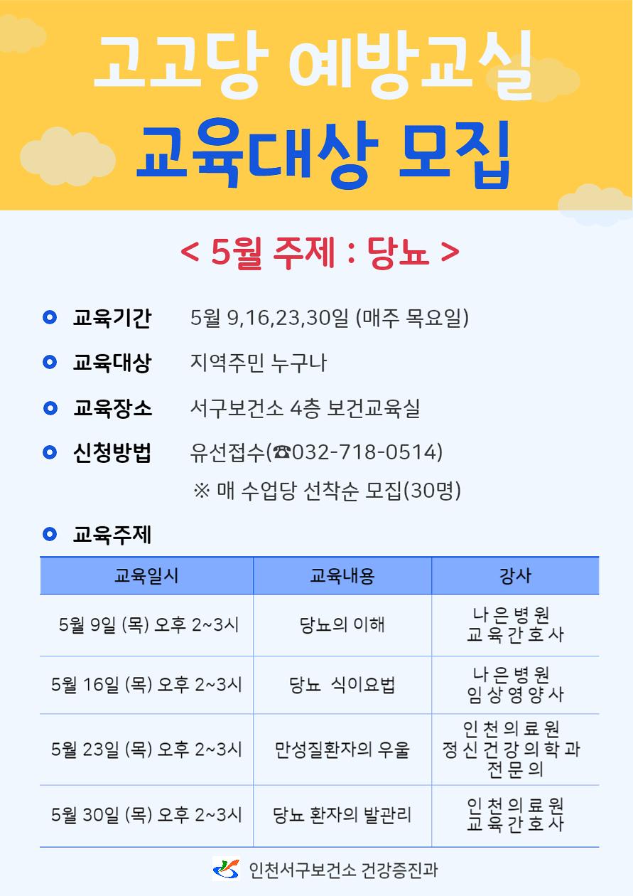 - 세부일정 : 5/9 당뇨의 이해, 5/16 당뇨 식이요법, 5/23 만성질환자의 우울, 5/30 당뇨 환자의 발관리