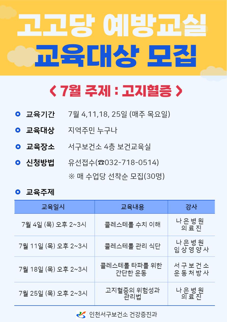- 세부일정 : 7/4 콜레스테롤 수치 이해, 7/11 콜레스테롤 관리 식이요법,
