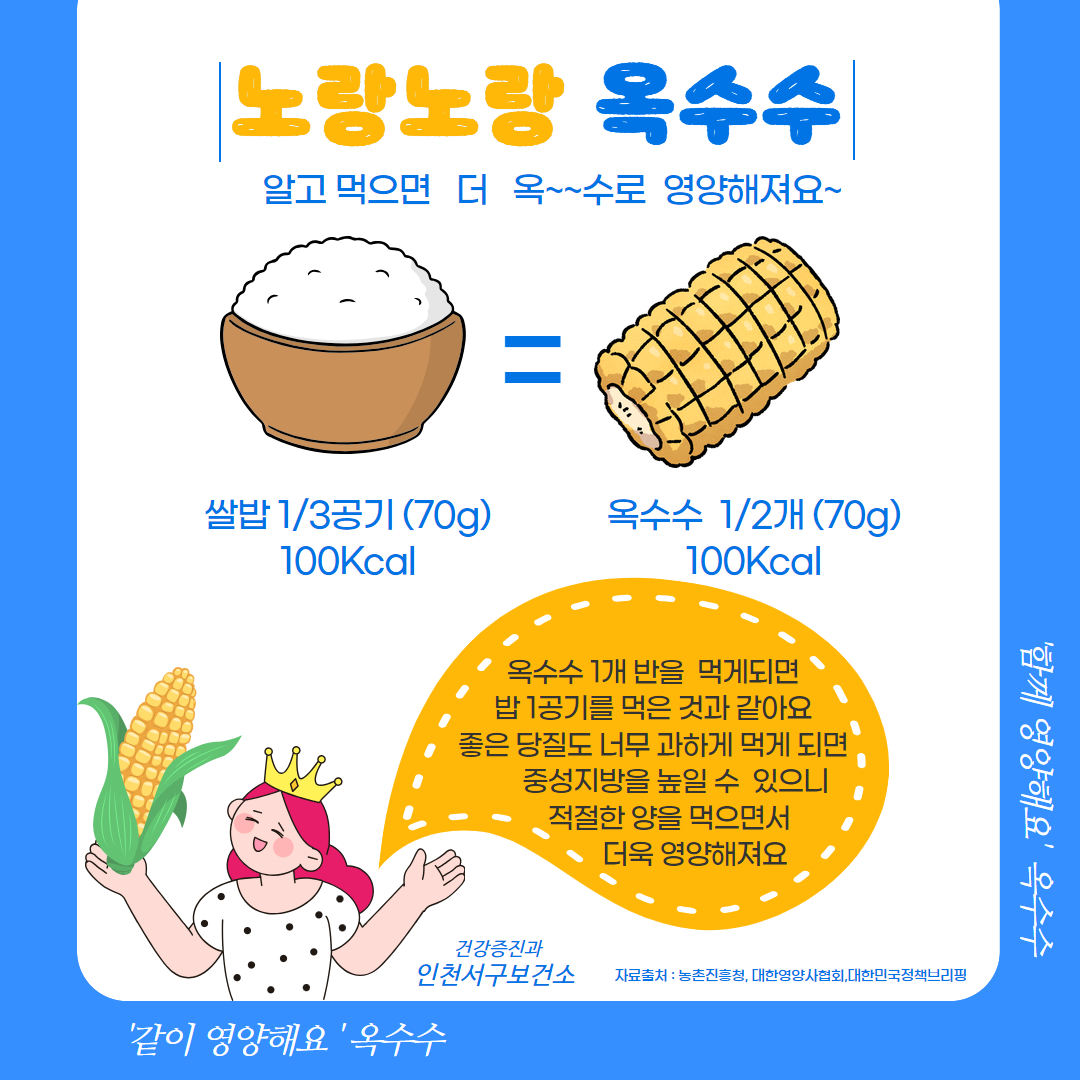 쌀밥 1/3공기(70g) 100Kcal = 옥수수1/2개(70g) 100Kcal