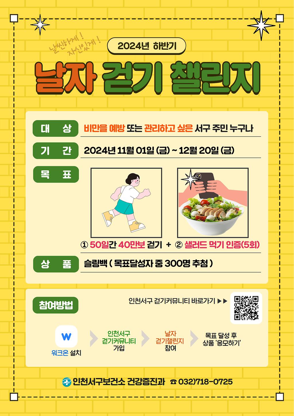 - 참여방법: 워크온 ‘인천서구 걷기커뮤니티’ 가입 후 날자 걷기챌린지 참여