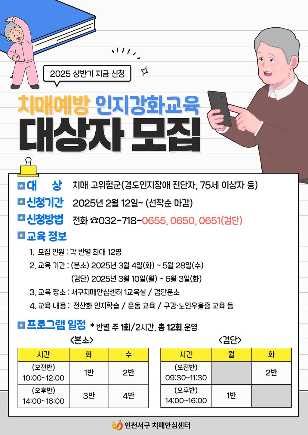 인천 서구 치매안심센터에서는 치매 예방에 관심이 있는 치매 고위험군을 대상으로 인지강화교육 프로그램을 운영하고 있습니다.