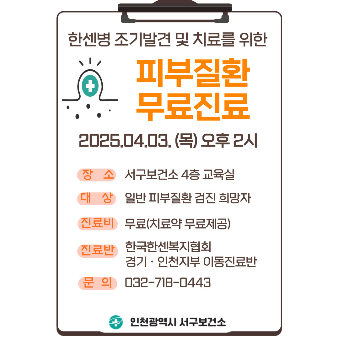 한센병 조기발견 및 치료를 위한 피부질환 무료진료(25.4.3.오후2시~3시)