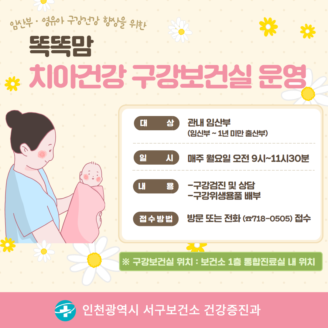 서구보건소에서는 임산부를 대상으로 구강건강서비스를 제공하는 「2025년 똑똑맘 치아건강 구강보건실」을 운영하고 있습니다.