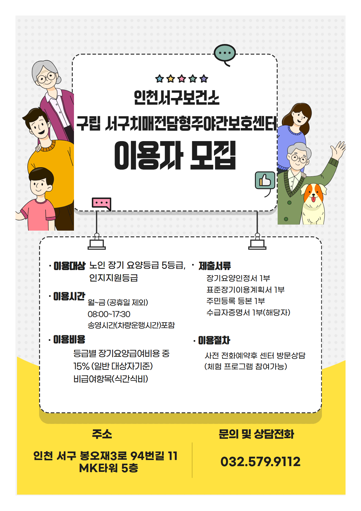 구립 서구 치매전담형 주야간보호센터(치매안심돌봄터)에서, 이용을 희망하는 어르신을 모시고자합니다.